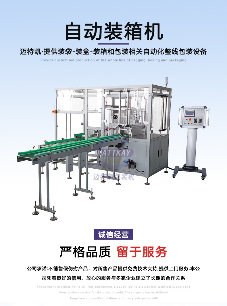 本自動裝箱機是采用紙箱側翻、產品平推式入箱方式裝箱,其中涉及產品來料、理料、推料、紙箱翻轉等機構,裝箱機采用PLC控制,無須人工千預;此外設備可以根據客戶裝箱要求,在前期排列整理過程中即可自動完成所需的裝箱方式整理。